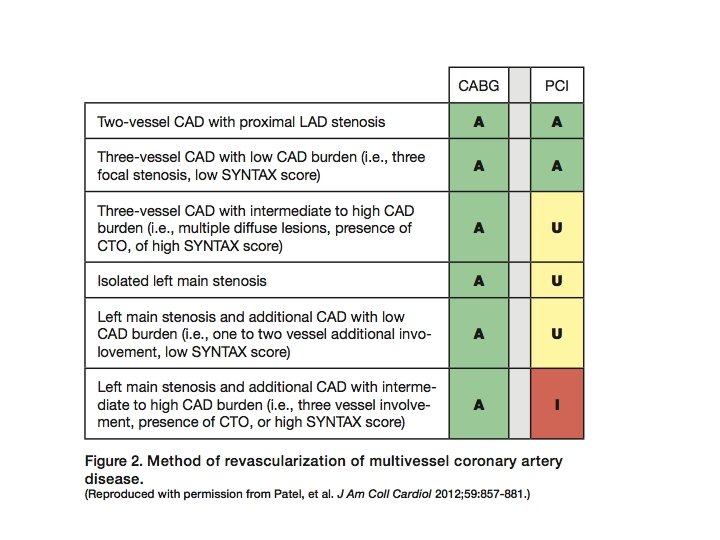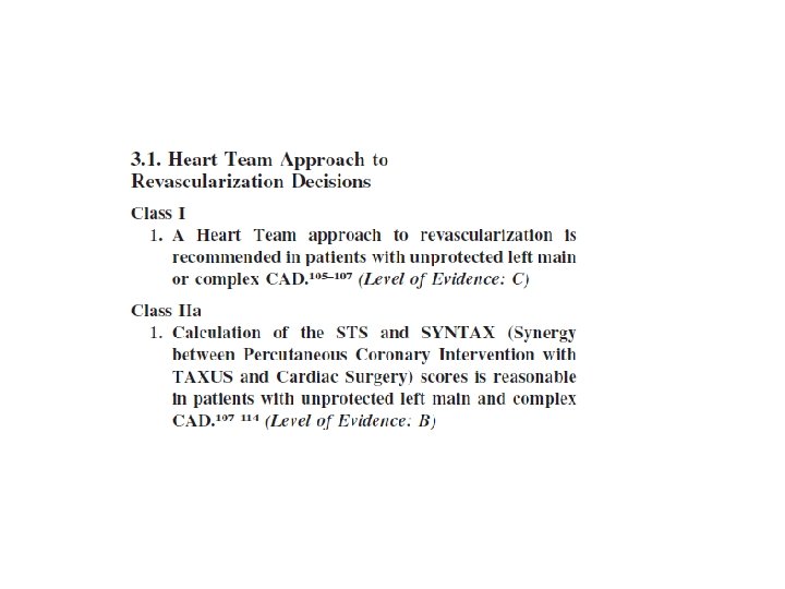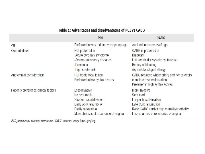 • The risk of repeat revascularization after PCI needs to be balanced against the invasiveness of CABG and the risk of stroke, as previously reported in a meta-analysis of 23 studies comparing CABG and PCI, in which procedure-related strokes were found to be more common after CABG (in 1. 2% of patients, vs. 0. 6% of those undergoing PCI; P<0. 001), without a concomitant decrease in survival • Aortic manipulation releases embolic material, thereby enhancing the probability of adverse neurologic outcomes following coronary artery bypass grafting (CABG). Single aortic clamping in coronary artery bypass surgery reduces cerebral embolism and improves neurocognitive outcomes Hrvoje Gasparovic, Vascular Medicine 18(5) 275– 281