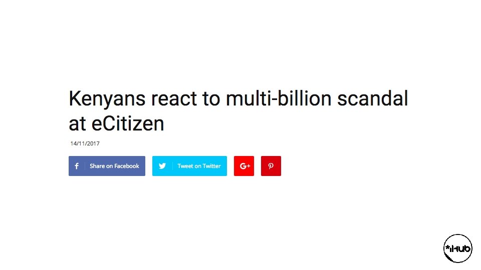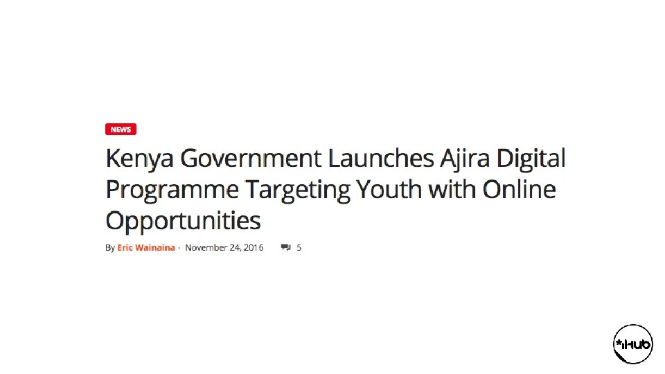 Findings • Enthusiasm by citizens to access government services conveniently • Technical manpower gaps needed to meet citizen needs in handling ICT tools • Lack of educational programs targeting citizens to uptake ICTs • ICT platforms have not been localised – language, citizen needs • Infrastructure gaps in certain counties in Kenya • Cost of access (devices & internet packages) locking out majority of Kenyans • Cyber café culture a win in accessing e-government services