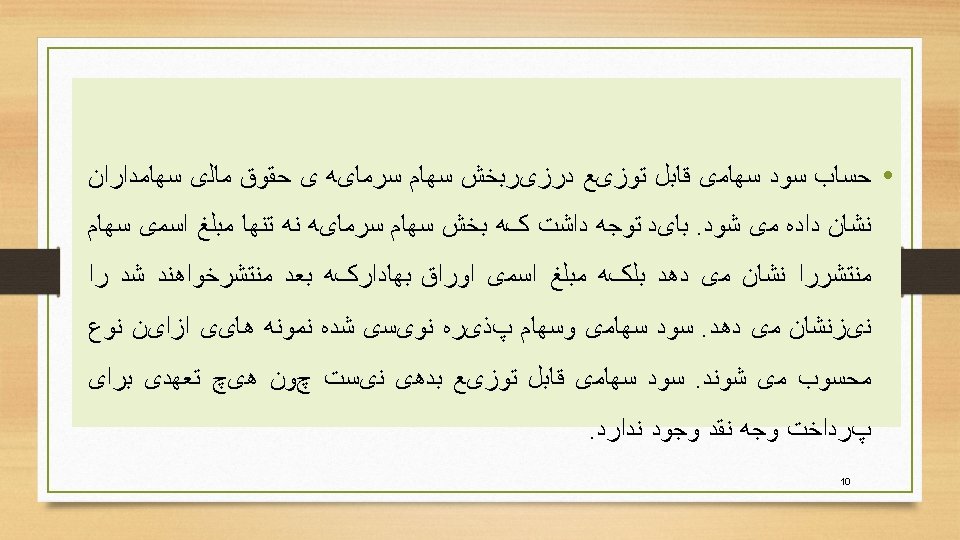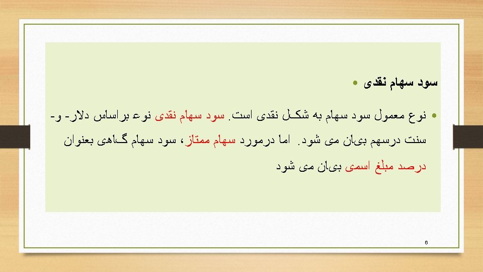• Cash dividends • The usual type of dividend is in the form of cash. A cash dividend is typically expressed on a dollar-andcents-per-share basis. However, with preferred stock, the dividend is sometimes expressed as a percentage of par value. 5