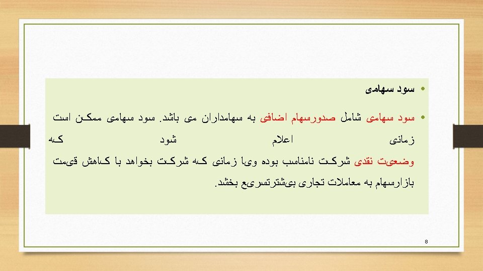 • Stock dividends A stock dividend involves the issuance of additional shares to stockholders. A stock dividend may be declared when the cash position of the firm is inadequate and/or when the firm wishes to prompt more trading by reducing the market price of stock 7