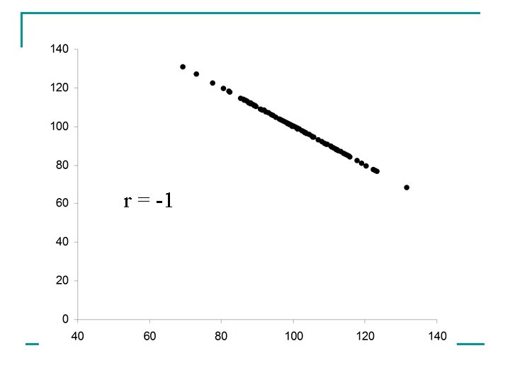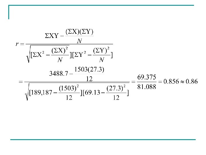 The Pearson Product-Moment Correlation Coefficient n r n the ratio of the joint variation of X and Y (covariance) relative to the variation of X and Y considered separately n Conceptually n Values of r near 0 indicate a very weak linear relationship…Values of r close to -1 or +1 indicate that the points lie close to a straight line. The extreme values of -1 and +1 occur only when the points lie exactly along a straight line.