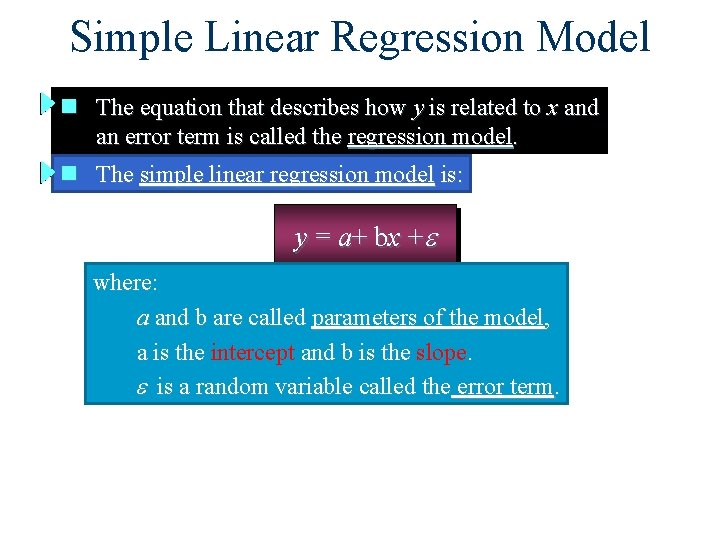 Simple Linear Regression Model n The equation that describes how y is related to x and an error term is called the regression model. n The simple linear regression model is: y = a+ bx +e where: a and b are called parameters of the model, a is the intercept and b is the slope. e is a random variable called the error term.