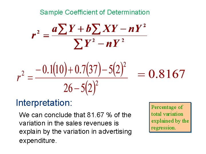 Sample Coefficient of Determination Interpretation: We can conclude that 81. 67 % of the variation in the sales revenues is explain by the variation in advertising expenditure. Percentage of total variation explained by the regression.