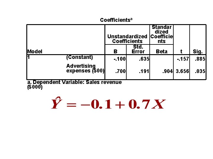 Coefficientsa Model 1 (Constant) Advertising expenses ($00) Standar dized Unstandardized Coefficients Std. B Error Beta t Sig. -. 100. 635 -. 157. 885. 700 a. Dependent Variable: Sales revenue ($000) . 191 . 904 3. 656 . 035