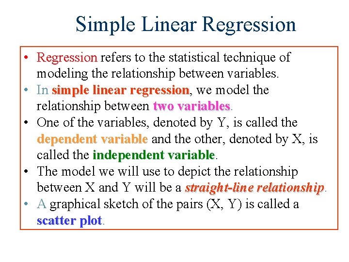 Simple Linear Regression • Regression refers to the statistical technique of modeling the relationship between variables. • In simple linear regression, regression we model the relationship between two variables • One of the variables, denoted by Y, is called the dependent variable and the other, denoted by X, is called the independent variable • The model we will use to depict the relationship between X and Y will be a straight-line relationship • A graphical sketch of the pairs (X, Y) is called a scatter plot