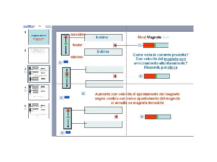 massimo Nord Magnete Sud tester bobina 300 spire minimo bobina Come varia la corrente prodotta? Con magnete grosso, piccolo Rispondi, poi clicca 300 spire La corrente prodotta, a parità di velocità di spostamento del magnete, varia con la forza del magnete
