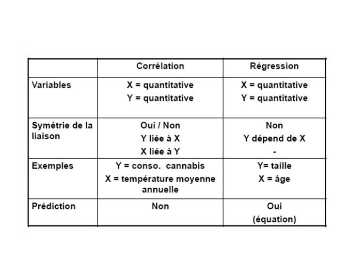 Le test du coefficient de corrélation consiste à calculer la grandeur To et à la comparer à la valeur seuil tα sur la table de la loi de Student à (n-2) degrés de libertés. Conditions d’application • indépendance des observations • liaison linéaire entre X et Y • distribution conditionnelle normale et de variance constante