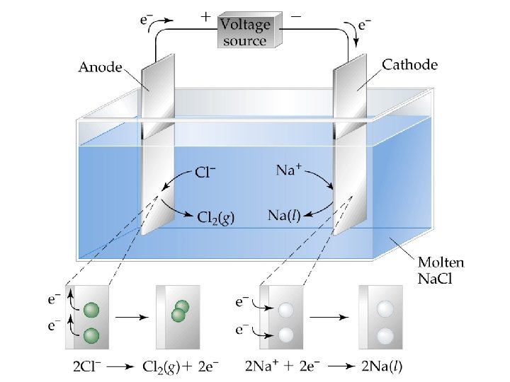 • • Example, decomposition of molten Na. Cl. Cathode: 2 Na+(l) + 2 e- 2 Na(l) Anode: 2 Cl-(l) Cl 2(g) + 2 e-. Industrially, electrolysis is used to produce metals like Al.