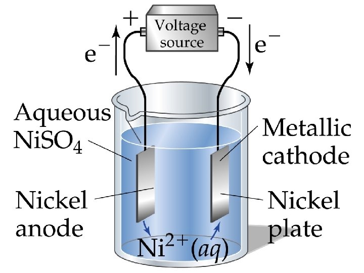 • Consider an active Ni electrode and another metallic electrode placed in an aqueous solution of Ni. SO 4: • Anode: Ni(s) Ni 2+(aq) + 2 e • Cathode: Ni 2+(aq) + 2 e- Ni(s). • Ni plates on the inert electrode. • Electroplating is important in protecting objects from corrosion.