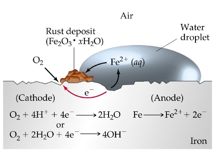 Corrosion • • • Corrosion of Iron Since E red(Fe 2+) < E red(O 2) iron can be oxidized by oxygen. Cathode: O 2(g) + 4 H+(aq) + 4 e- 2 H 2 O(l). Anode: Fe(s) Fe 2+(aq) + 2 e-. Dissolved oxygen in water usually causes the oxidation of iron. Fe 2+ initially formed can be further oxidized to Fe 3+ which forms rust, Fe 2 O 3. x. H 2 O(s).