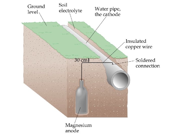 Preventing Corrosion of Iron • To protect underground pipelines, a sacrificial anode is added. • The water pipe is turned into the cathode and an active metal is used as the anode. • Often, Mg is used as the sacrificial anode: Mg 2+(aq) +2 e- Mg(s), E red = -2. 37 V Fe 2+(aq) + 2 e- Fe(s), E red = -0. 44 V