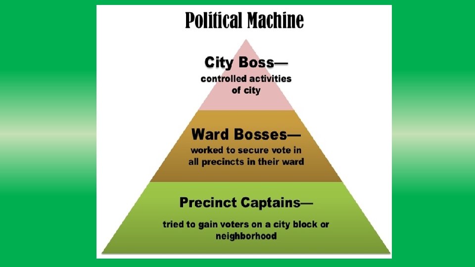 So What Makes Political Machine a Political Machine? • A Political Machine is a corrupt political network • Usually controlled by a main “boss” who gains loyalty from others through bribery and kickbacks • Take advantage of new immigrants to gain votes • Public Works projects (sewer, parks, etc. ) and improvements serve two purposes • Gain votes and support for the machine • Companies agree to overcharge for work, and then “kick back” money back to the politicians who contract them • For example, charge Govt. $500 for a $250 valued project, then give some of the profit back to the City Boss