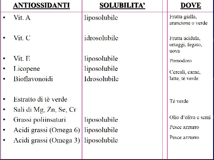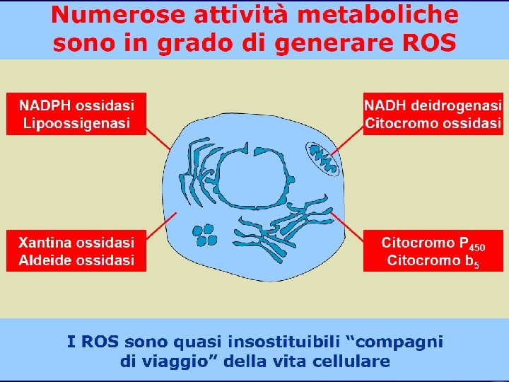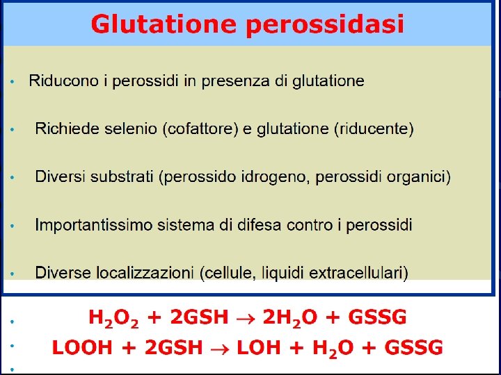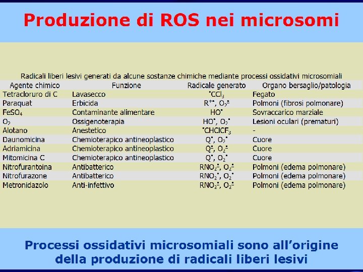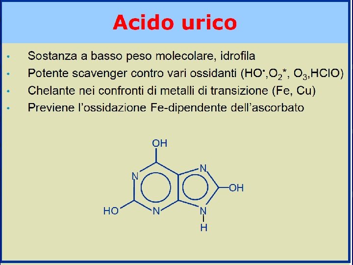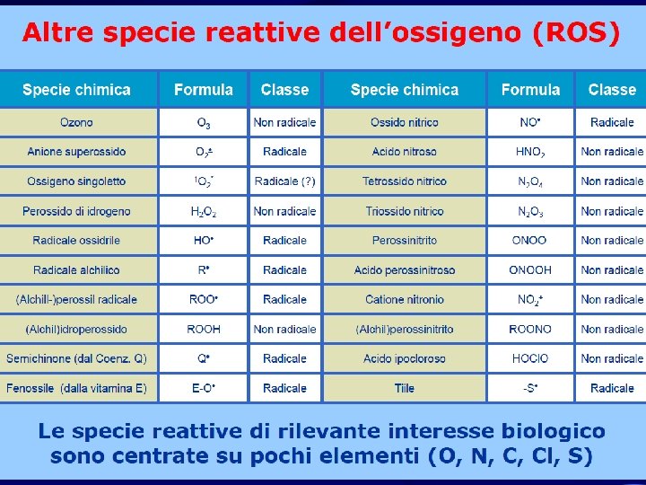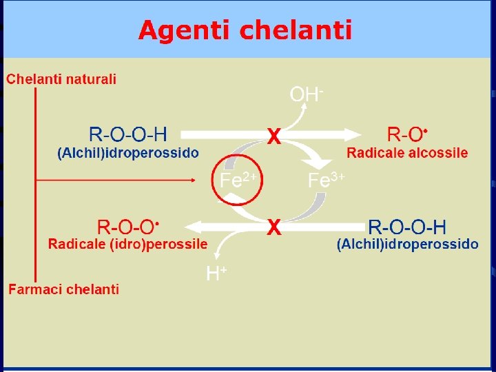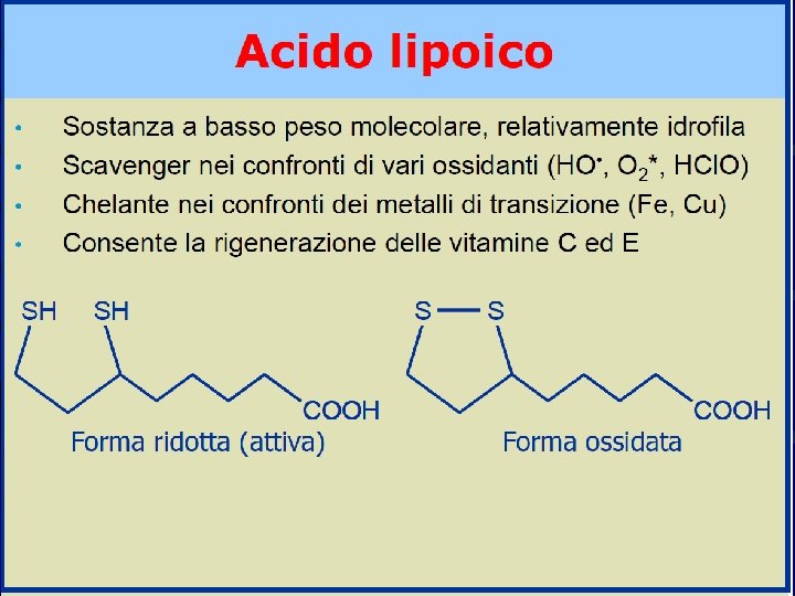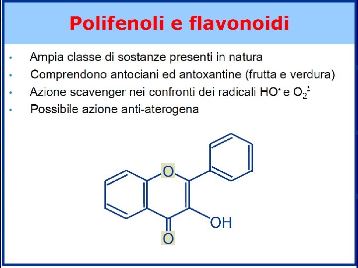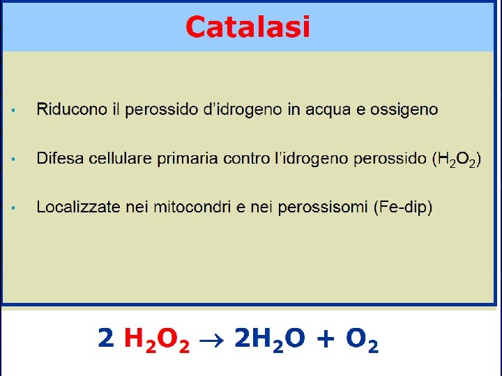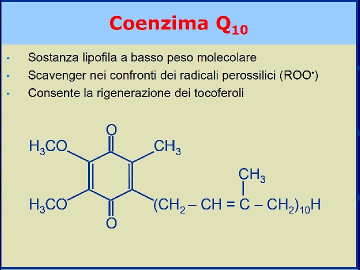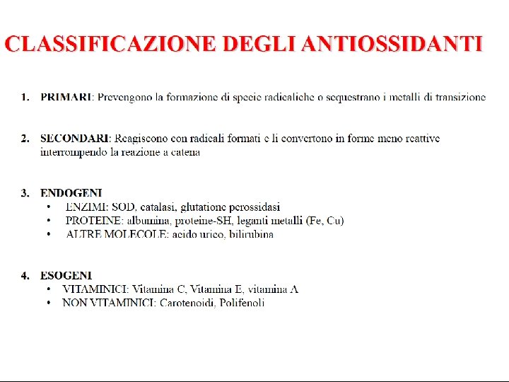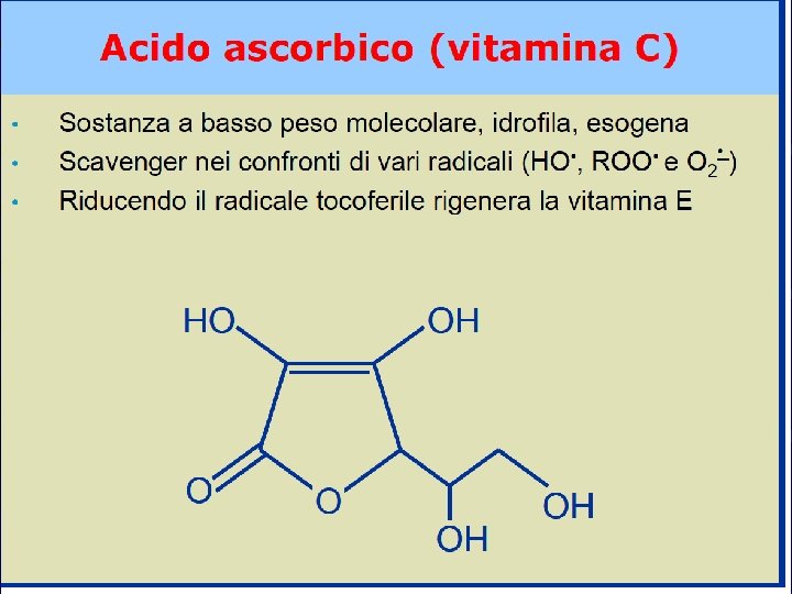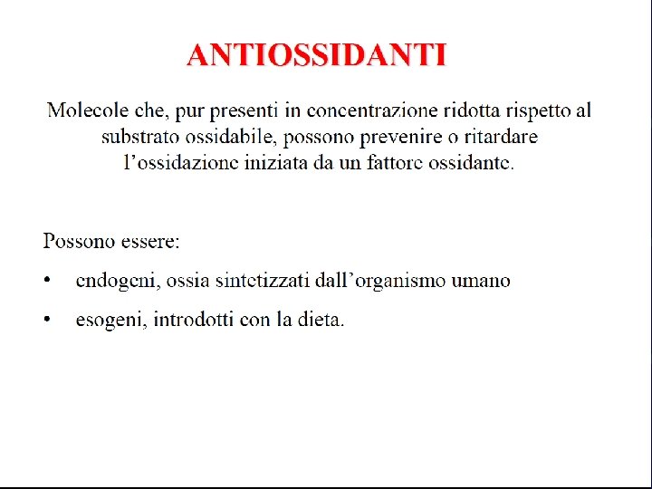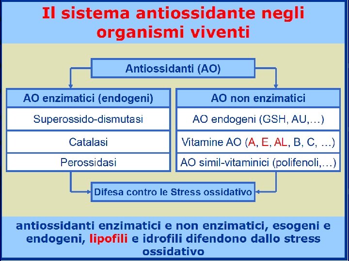Le difese Tutte le forme di vita aerobiche hanno dei sistemi di difesa o sistemi antiossidanti § Enzimi: proteine complesse che disattivano i radicali dell’ossigeno (superossido dismutasi) § Nutrienti: vitamine, betacarotene, bioflavonoidi forniscono elettroni per saturare i radicali liberi § Sistema di riparazione di danni al DNA