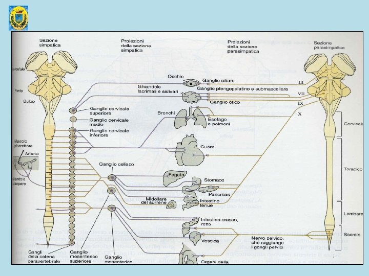 SIMPATICO – PARASIMPATICO: differenze anatomiche e funzionali Sistema nervoso simpatico: Assoni pregangliari corti, terminano in strutture vicine, assoni postgangliari lunghi. Gli assoni di un singolo ganglio si distribuiscono in maniera diffusa ed innervano molti organi le reazioni simpatiche sono diffuse e provocano la risposta dell’intero organismo. Sistema nervoso parasimpatico: Assoni pregangliari lunghi, terminano in gangli situati all’interno o n vicinanza degli organi che innervano le reazioni parasimpatiche possono essere localizzate a particolari organi o ghiandole.