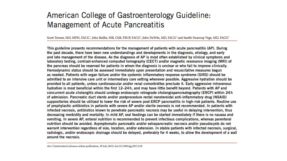 DIAGNOSI The diagnosis is established by the presence of 2 of the 3 following criteria: (1) abdominal pain consistent with the disease, (2) serum amylase and/or lipase greater than three times the upper limit of normal, and/or (3) characteristic findings from abdominal imaging. Contrast-enhanced computed tomography (CECT) and/or magnetic resonance imaging (MRI) of the pancreas should be reserved for patients in whom the diagnosis is unclear or who fail to improve clinically within the first 48– 72 h after hospital admission or to evaluate complications.