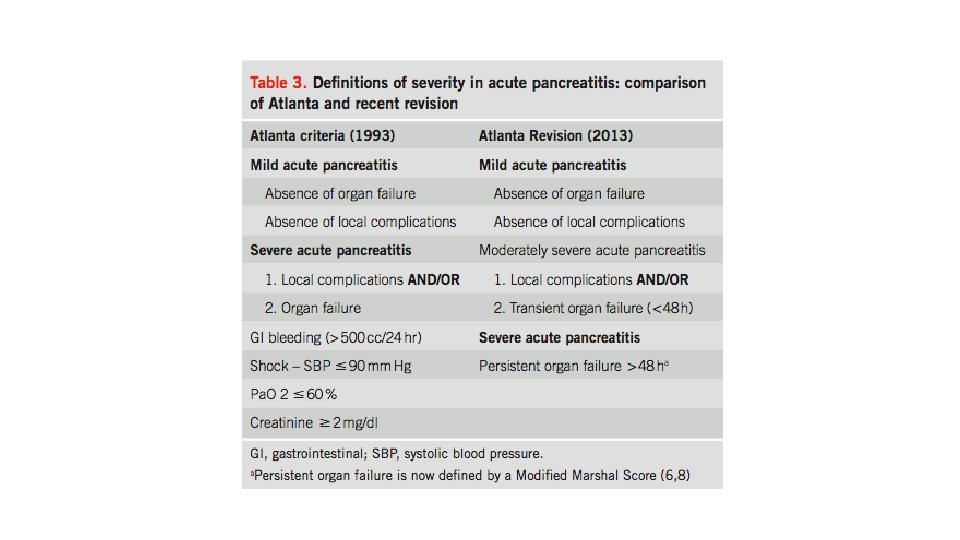 La pancreatite acuta lieve, generalmente ma non necessariamente edematosa, è caratterizzata da un decorso clinico favorevole che non presenta o ha minime disfunzioni d’organo La pancreatite acuta severa è un quadro clinico che si associa ad insufficienza d’organo e/o complicanze locali quali necrosi, ascessi o pseudocisti Bradley et al. “A clinically based classification system for acute pancreatitis. summary of the international symposium on acute pancreatitis”, Atlanta, GA, September 11 -13, 1992. Arch Surg 1993; 128: 586 -90