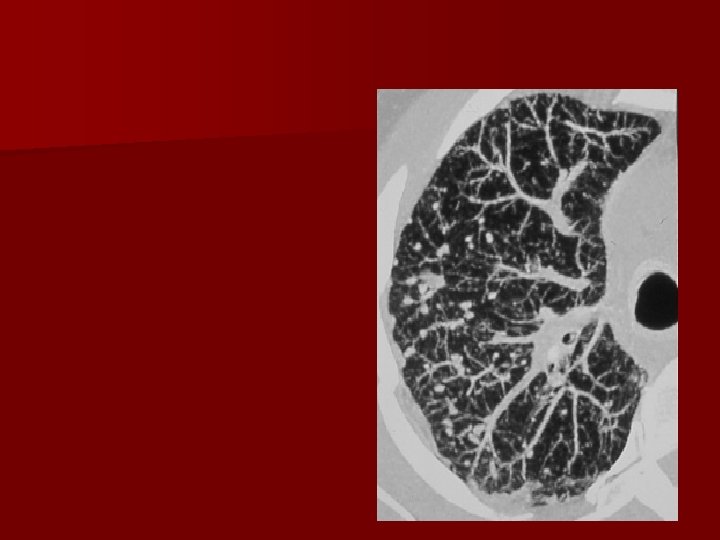 Distribuzione centrolobulare n Piccole vie aeree n Spazi aerei peribronchiolari n Noduli solidi n Tree in bud albero in germoglio n Noduli non solidi Bronchiolite infiammatoria