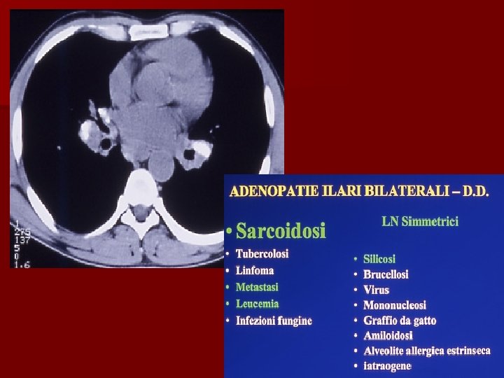Sarcoidosi • • • LN ilari bilaterali simmetrici broncopolmonari LN mediastinici a volte iperdensi debole calcificazione