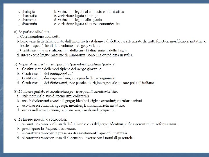Dall’intreccio dei vari assi… formale colto Diafasia Diamesia ia p o at i D scritto parlato Diastratia incolto informale
