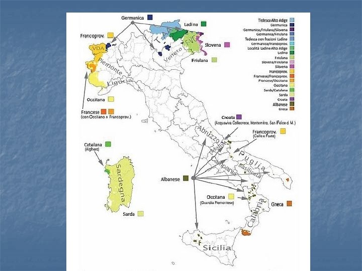 Le parlate alloglotte n n n Lingue materne di minoranze: una quindicina in Italia; 4, 8% popolazione. Ladino/friulano e sardo: lingue di minoranza o semplici dialetti? Tutela per le aree di confine sin dal secondo dopoguerra: bilinguismo. Per le altre “isole” linguistiche Legge n. 482 del 15. 12. 1999: fondi e progetti di valorizzazione anche a scuola. Troppo tardi? Risultati deludenti e indifferenza delle nuove generazioni. Ancora ignorate dalla Legge le minoranze linguistiche di immigrazione recente.
