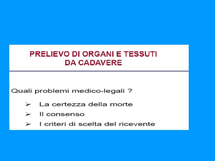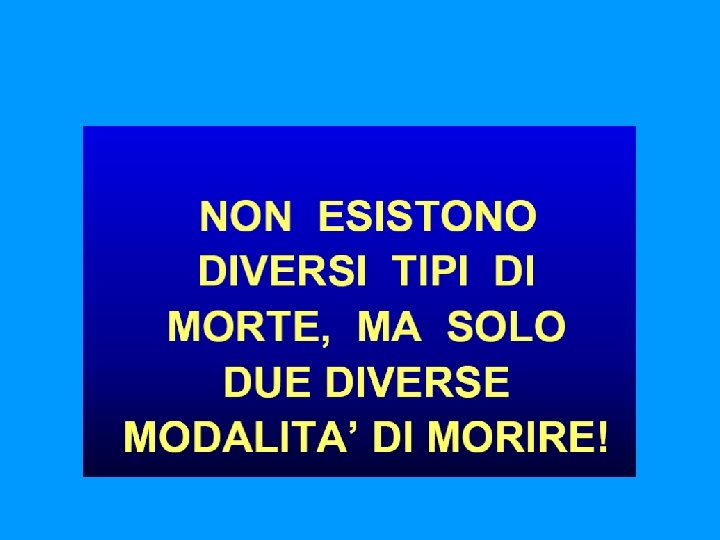 ACCERTAMENTO DELLA MORTE Osservazione (per 24 ore o, nei casi di morte improvvisa, per 48 ore) (certezza della morte deriva dalla comparsa dei segni della putrefazione, dalla presenza di ipostasi, dal raffreddamento, dallo sviluppo del rigor mortis; oppure morte per depezzamento, maciullamento, decapitazione, ecc, in cui è sufficiente il rilievo obiettivo di grave danno anatomico) E. C. G. piatto per non meno di 20’ (morte “cardiaca”) morte “cardiaca” Metodo NEUROLOGICO (morte cerebrale) morte cerebrale Non esistono diversi tipi di morte, ma solo diversi metodi per accertare lo stesso fenomeno