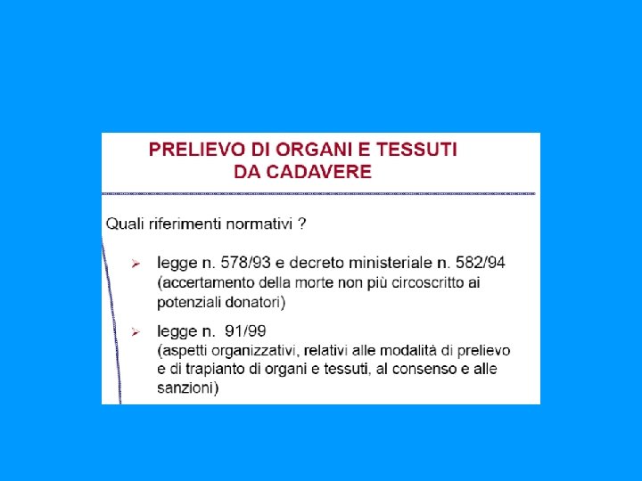 1. LEGGE n° 301 del 12 agosto 1993 • assenzo da parte dei familiari • accertamento della morte con ECG • prelievi in strutture pubbliche, private, a domicilio • centri di riferimento: informazione organizzazione deposito e conservazione esame, selezione, trattamento e consegna ricerca