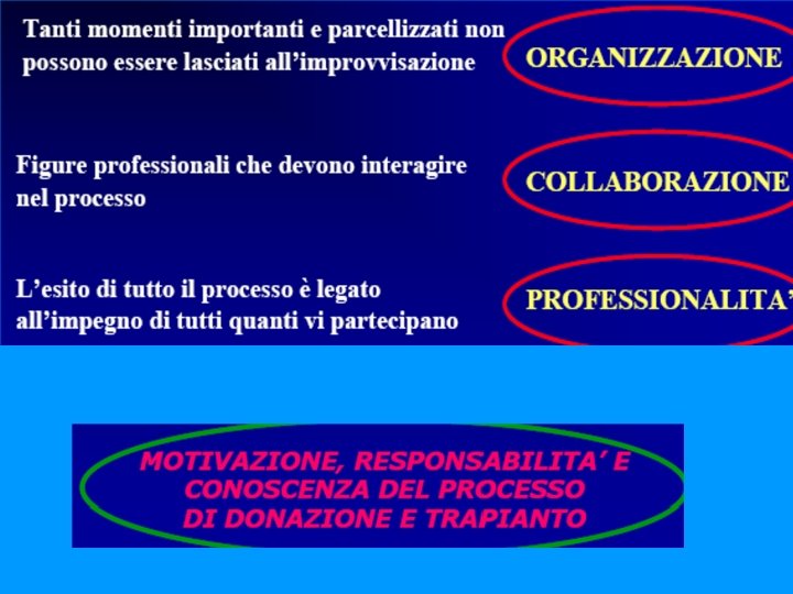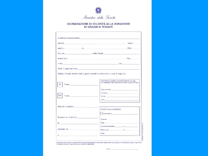 • Viene introdotto, infatti, l'obbligo di un esplicito assenso da parte dei familiari del donatore o dei suoi legali rappresentanti, sempre nel rispetto dell'opposizione al prelievo, eventualmente espressa in vita, ma per iscritto, da parte del soggetto.