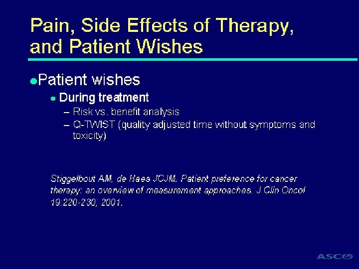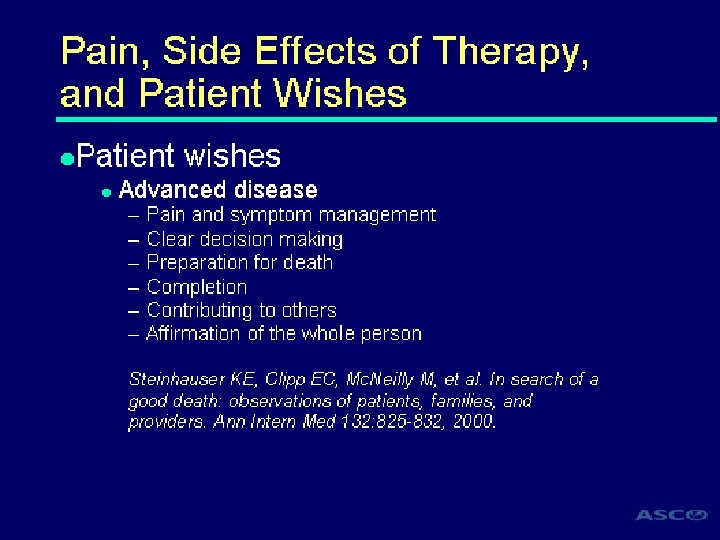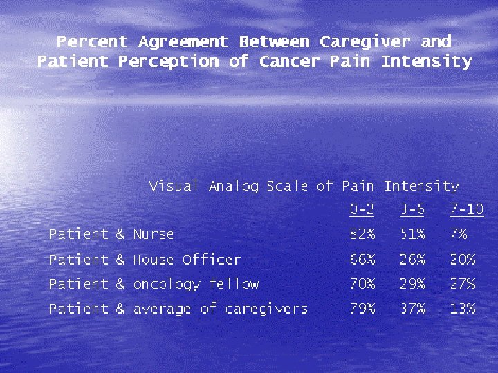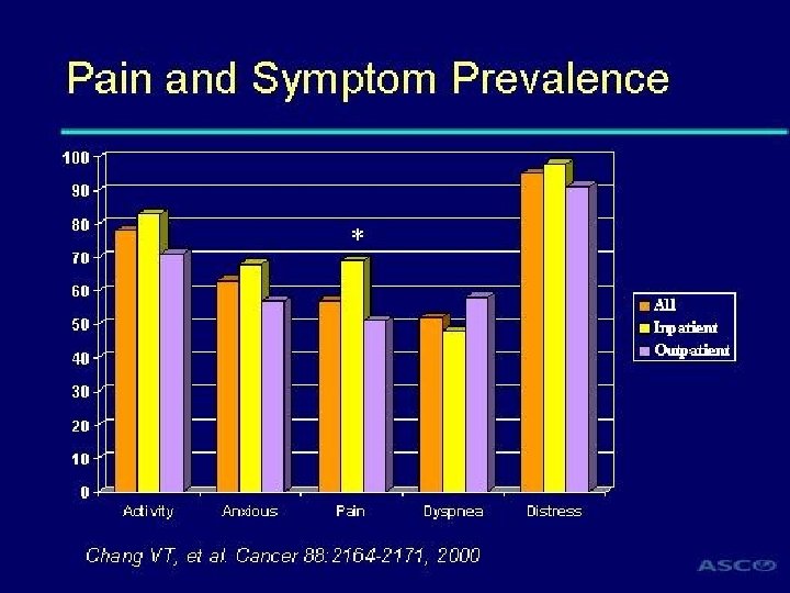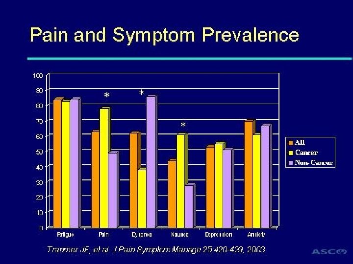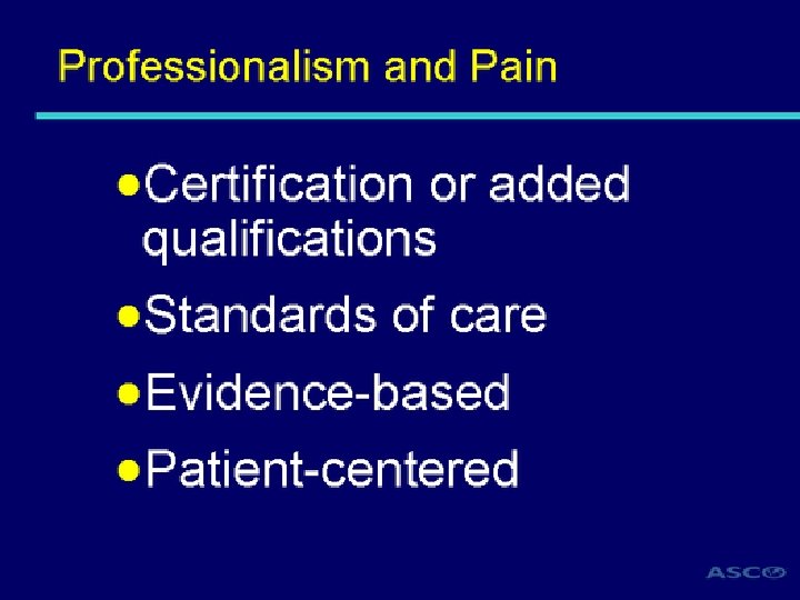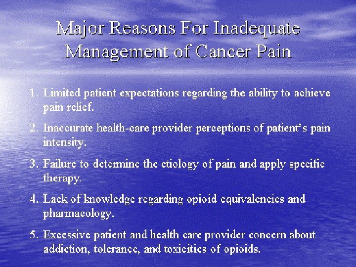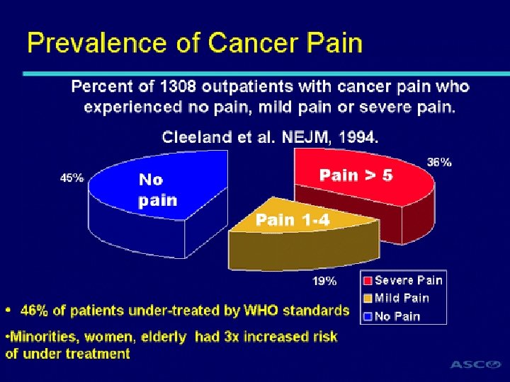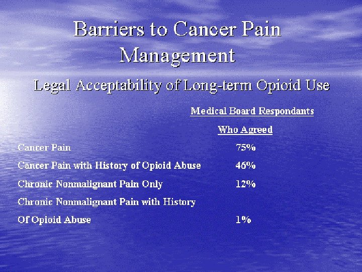 Barriere nei confronti del trattamento del dolore da cancro: la paura della tolleranza e della dipendenza psicologica (Paice, JPSM, 1998) Campione: 200 pazienti Fattori associati ad una più alta intensità del dolore: - pazienti ospedalizzati; - malattia metastatica; - esitazione nell’infastidire il personale infermieristico ; - preoccupazione su tolleranza e dipendenza psicologica % Effetto sullo score dell’intensità del dolor Mediana Paura della dipendenza psicologica 55. 6 2. 4 2. 0 Paura della tolleranza 39. 4 4. 4 5. 0 P = 0. 015