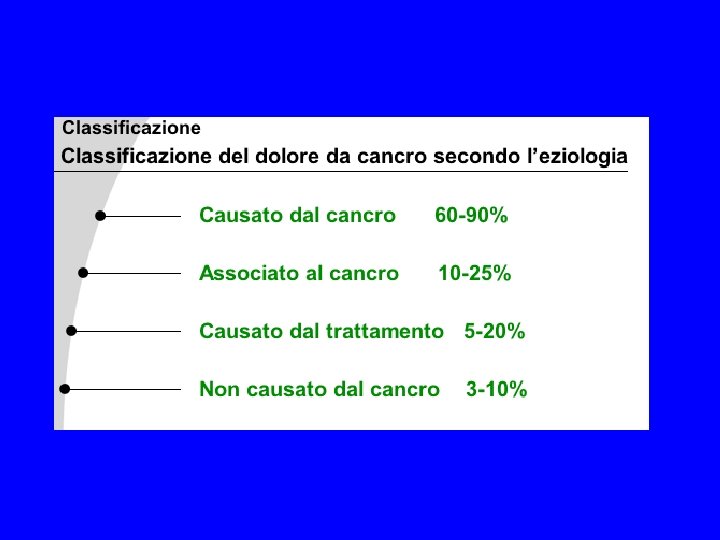 EPIDEMIOLOGIA L’ OMS ritiene che • Nel mondo, ogni anno, 5 milioni di persone muoiono di cancro e 7 milioni di nuovi casi sono diagnosticati. • almeno 4 milioni di persone presentino dolore da cancro. • il 50% di tali pazienti riceve un trattamento antalgico insufficiente.