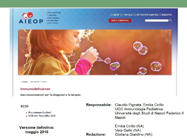 Take home messages • Considerare la possibilità di una ID è la chiave per diagnosticarla • La SCID rappresenta un’emergenza pediatrica • Le SCIDs sono malattie curabili se diagnosticate e se la gestione è affidata a un Centro specializzato in Immunodeficienze (la contaminazione ambientale rappresenta un enorme rischio per la vita del paziente !!! HLH secondaria) • La diagnosi molecolare richiede test funzionali e studi genetici di nuova generazione che devono essere effettuati presso centri specializzati per le enormi difficoltà di interpretazione