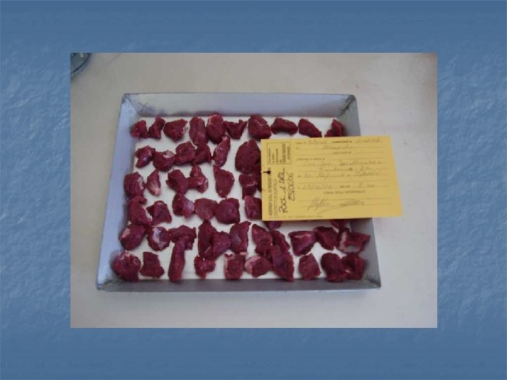 Campioni n Suino 1 grammo dal pilastro del diaframma n 2 grammi per scrofe o verri n 2 grammi altri punti diaframma o mascella, lingua, muscoli addominali (4 g per scrofe o verri) n Altri muscoli 5 grammi n n Equino n 10 grammi di lingua o massetere