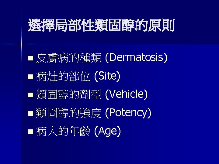 常用類固醇製劑比較 抑制ACTH 抗發炎 留鹽 效應 半衰期(分) Hydrocortisone <24 hrs 1 ++ 90 Prednisolone <36 hrs 4 + 200 Methylprednisolone <36 hrs 5 0 180 25 0 200 Dexamethasone >48 hrs