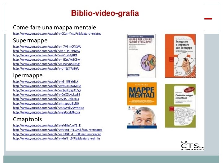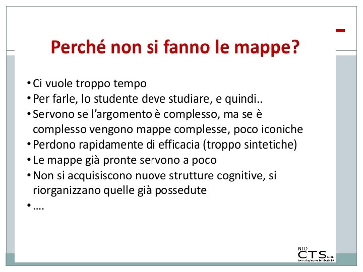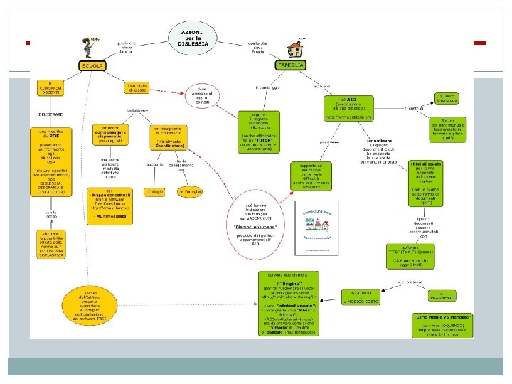Perché le mappe sono utili ai ragazzi con DSA �Visualizza l’ordine dell’esposizione. �Le connessioni logiche dei concetti facilitano la comprensione. �I concetti sono riassunti in singole parole. �Ciò permette il recupero veloce delle informazioni. �Permette l’inserimento di concetti e parole nuove in una rete visibile. �In generale minimizza i punti deboli del ragazzo DSA: lentezza nella lettura/scrittura, disorganizzazione, attenzione limitata. �Consiglio finale: utilizzare computer 0 tablet per produrre M. C. : organizza lo spazio,