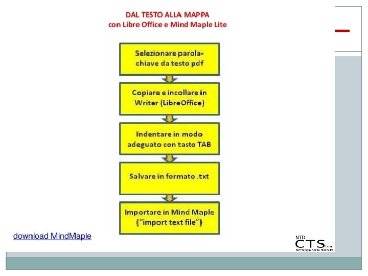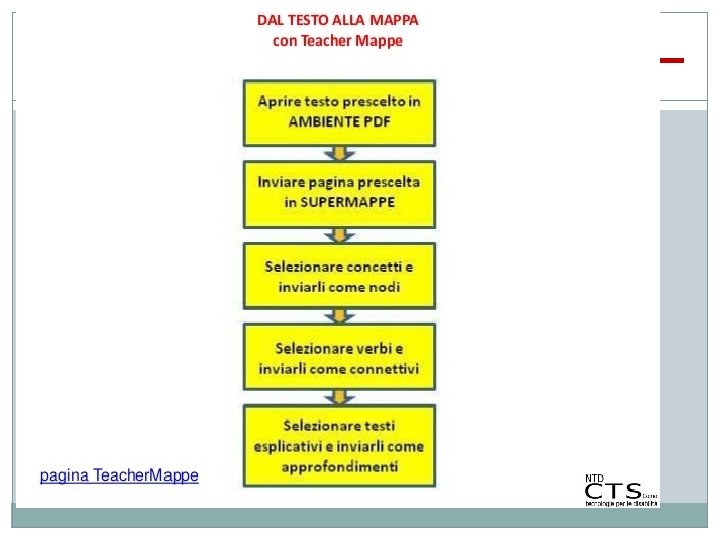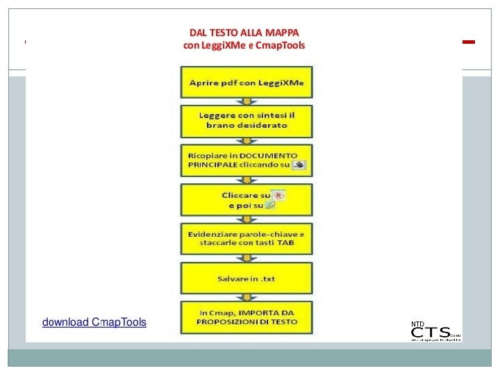 Dal Testo alla Mappa � Per costruire una mappa a partire da un testo occorre eseguire le seguenti azioni: q Leggerlo con attenzione, comprenderlo e rileggerlo; q Individuare ed evidenziare le parole chiave che compaiono nel testo; q Organizzare le parole chiave suddividendole in nodi (concetti) e relazioni (frecce ed etichette);