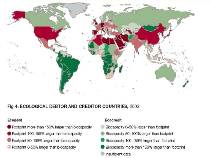 ATTRAVERSO I FLUSSI COMMERCIALI L’importazione I PAESI RICCHI IMPORTANO PEZZI RILEVANTI DI BIOCAPACITA’ SOTTO FORMA DI MATERIE PRIME ED ENERGIA DAI PAESI IN DIFFICOLTA’ DI SVILUPPO, GENERANDO UN EVIDENTE di biocapacità DEBITO ECOLOGICO