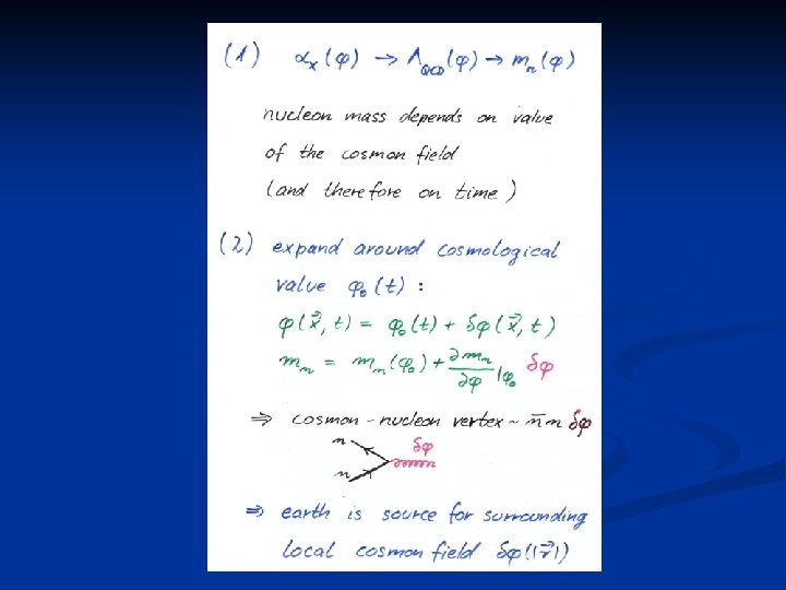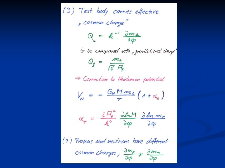 Violation of equivalence principle Different couplings of cosmon to proton and neutron Differential acceleration p, n earth “Violation of equivalence principle” only apparent : new “fifth force” ! cosmon p, n
