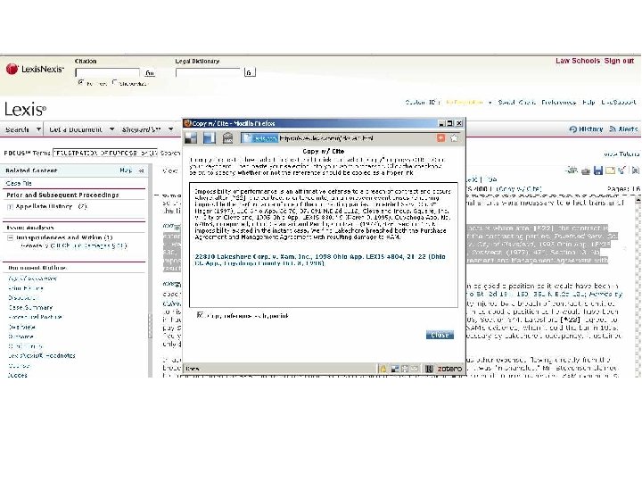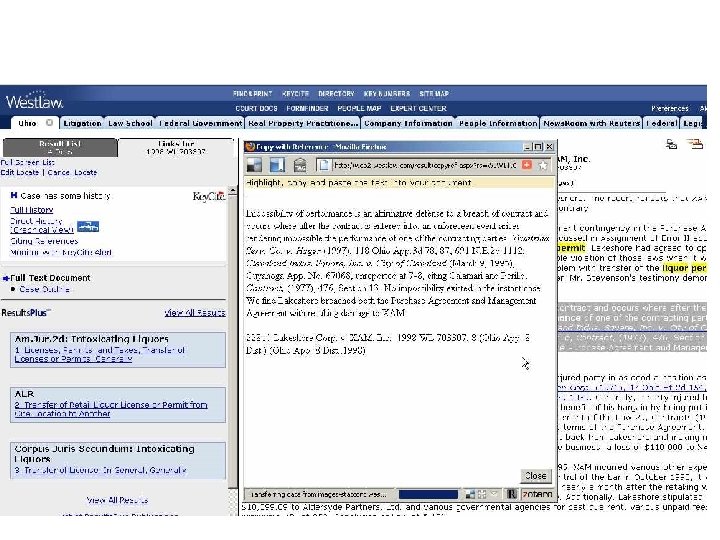Cost Effective Searching-Lexis & Classic WL l Narrowest Source l Broad Search, then Focus/Locate l Table of Contents l Book Browse on LEXIS (not Westlaw) l History (L) or Research Trail (W) – (next day) l Westlaw – search transactional or hourly?