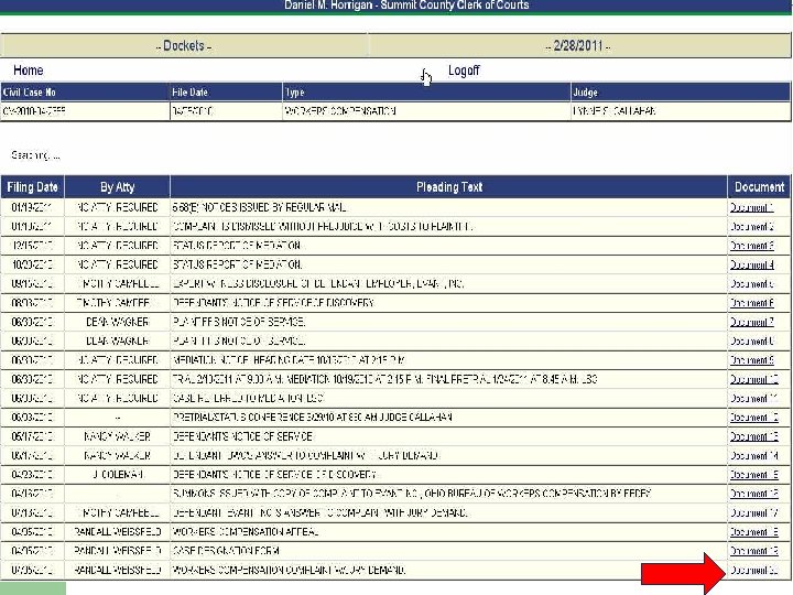 Finding Dockets, Pleadings, Motions l l l LLRX or Resources for Online Court Dockets to find dockets Some dockets have full text documents ex. Ohio – Montgomery & Summit Counties, federal PACER – Federal Court dockets