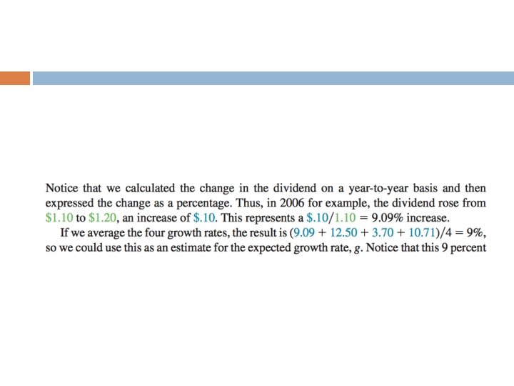 D 1 = D 0(1+g) Dividend yield (D 1 / P 0) Capital gains yield (g)