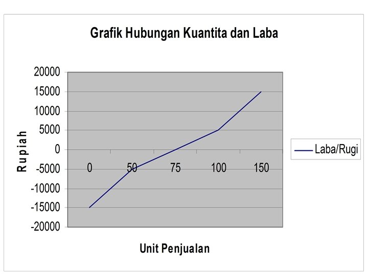 Penjual an Rupiah Total Biaya 37500 30000 25000 18000 5000 3000 10 25 50 75 100 Grafik Titik Impas dengan Pendekatan Laba Rugi Total Kuantit a