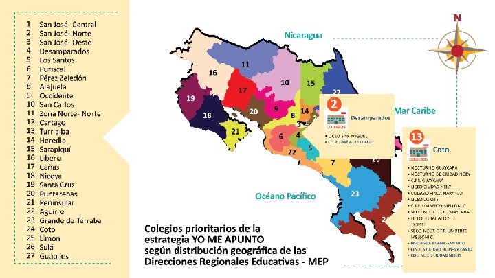 5 3 Pérez Zeledón Grande de Térraba Coto Puntarenas Peninsular Aguirre EXCLUIDOS Núcleo Absoluto 4 1. 876 5 1. 594 3 2. 673 1 4. 260 6 334 2 2. 857 Total 13. 594 Relativo 13, 8 11, 7 19, 7 31, 3 2, 5 21, 0 100, 0 Puriscal Heredia Occidente 2 Desamparados SJ Oeste SJ Central SJ Norte Alajuela NÚCLEOS Direcciones Regionales de Educación Sulá Limón Guápiles Sarapiquí 1 San Carlos Los Santos Cartago Turrialba 6 Liberia Cañas Zona Norte 4 Norte Santa Cruz Nicoya