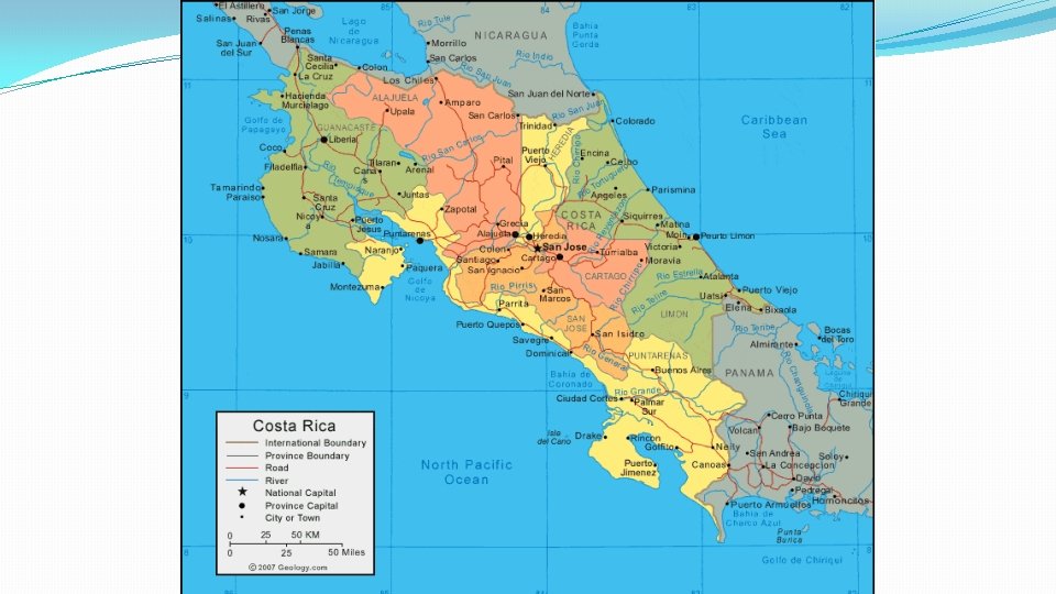 Geography �Borders the Caribbean Sea and the North Pacific Ocean and is between Nicaragua and Panama �Total area: 51, 100 square kilometers �Capital city: San José �Other big cities: Alajuela, Cartago, Heredia, Puntarenas