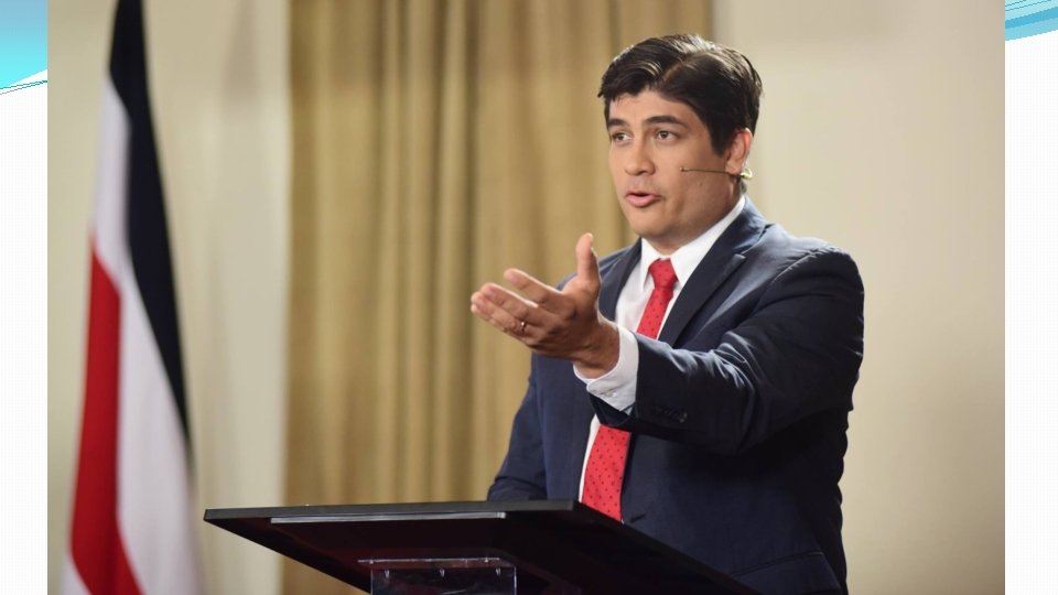 Carlos Alvarado Quesada �Carlos Alvarado Quesada is the 48 th President of Costa Rica and is a member of the center-left Citizens’ Action Party. �He was previously Minister of Labor and Social Security during the Presidency of Solís Rivera. �He is the youngest serving Costa Rica President since Alfredo González Flores in 1914. �Alvarado Quesada argued to respect the Inter-American Court of Human Rights’ ruling that Costa Rica recognize same-sex marriages, resulting in him winning the election in a landslide.