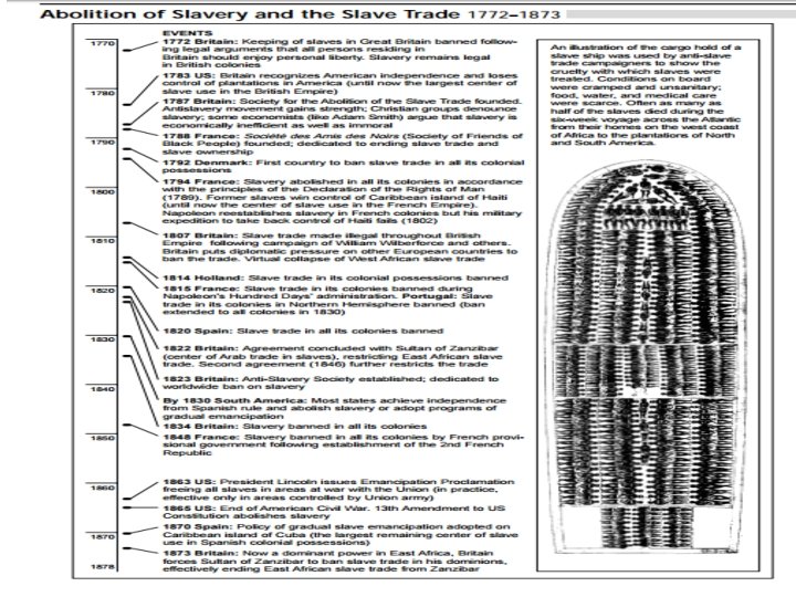 The Abolition of Slavery � 1807 = Britain ended the sale of slaves within its empire � 1834 = Britain freed all remaining slaves �British naval vessels patrolled the Atlantic, intercepted illegal slave ships, and freed the people on board �Other countries followed suit over the next half century