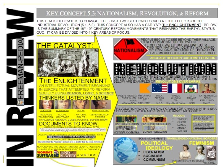 Goals of Revolution �Popular Sovereignty ( independence) freedom from the absolute monarchy with an emphasis on power residing in the many and not the one or few, �Free trade ( Laissez-Faire Capitalism) �Enlightened ideals- freedoms of life, liberty, property, speech, religion etc. �Constitutions which provided a framework for those rights and roles of governmental power.