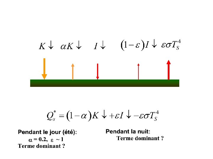 Albédo de la surface L ’albédo de la surface représente la fraction d ’énergie solaire réfléchie par la surface. L ’albédo depend: 1) de l ’angle d ’incidence des rayons solaires 2) de l ’état d ’humidité de la surface 3) de la hauteur de la végétation Type de surface albédo --------------------------océan 0. 05 - 0. 5 forêt tropicale 0. 07 - 0. 15 conifère 0. 1 - 0. 19 feuillus 0. 14 - 0. 2 sol foncé mouillé 0. 1 sable mouillé 0. 1 - 0. 25 sable sec 0. 2 - 0. 4 neige fraîche 0. 65 - 0. 95 vieille 0. 45 - 0. 65