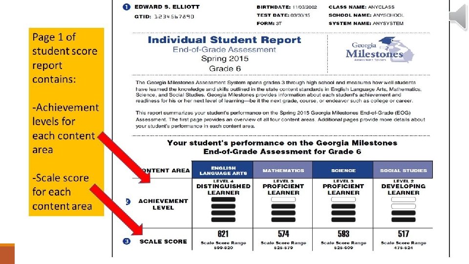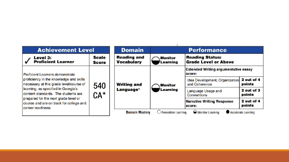 What do the levels tell us? Pink Sheet BEGINNING LEARNERS (Level 1) • Lack important knowledge and skills to be successful in this subject. • Need substantial support to be ready for the next grade level or course. DEVELOPING LEARNERS (Level 2) • Have some of the knowledge and skills necessary in this subject. • Need additional support to be prepared for the next grade level or course. PROFICIENT LEARNERS (Level 3) • Have the knowledge and skills to be successful in this subject. • Are prepared for the next grade level or course. DISTINGUISHED LEARNERS (Level 4) • Have advanced knowledge and skills in this subject. • Are well prepared for the next grade level or course.