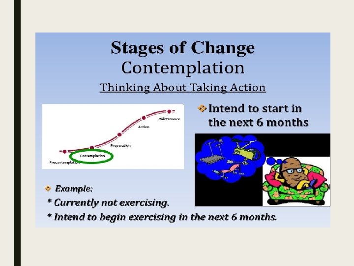 Stages of Counseling A. Pre -contemplation Stage (patient is not ready to change behavior). B. Contemplation Stage (patient is thinking about changing behavior). C. Preparation Stage (patient intends to change behavior in the next six months and is taking steps toward becoming more active). D. Action/maintenance Stage (patient has met the recommended goals for more than one month [action] or more than six months [maintenance])