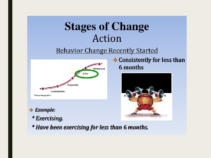 3 rd A – Agree Contemplation stage (the patient is thinking about changing) discuss the next steps Approach Increase the “pros” of changing. Recommendation : • Emphasize benefits that the patient cares about. • Associate the benefits with increased physical activity • Suggest that the patient help someone he or she cares about get physically active for health (to increase self-motivation)