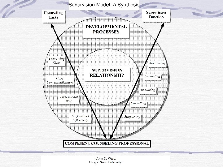 Reflective Process of the Supervision Relationship Supervisory Reflective Cycle Phases of Supervision 1. Disorienting Professional Experience(s) CONTEXTUAL ORIENTATION 2. Supervision Relationship ESTABLISHING TRUST Supervisee is anxious with a perceived sense of professional inadequacy. Supervisor is nonjudgmental, supportive and validating 3. Supervisor Intervention Supervisor seeks to expand supervisee conceptual complexity to promote clinical independence. 4. Shift in Supervisee Perception and/or Behavior and Reemergence to the Counseling Context Supervisee links supervision experience to clientele/context Supervisee experience of Cognitive and Emotional Dissonance in adjustment to the counseling climate Experience of trust central to supervisee willingness to address dissonant internship experiences CONCEPTUAL DEVELOPMENT Supervisor promoting advanced conceptual complexity through thematic and reflective dialogue CLINICAL INDEPENDENCE Supervisor facilitates supervisee autonomy by encouraging self assessment and self generation activities